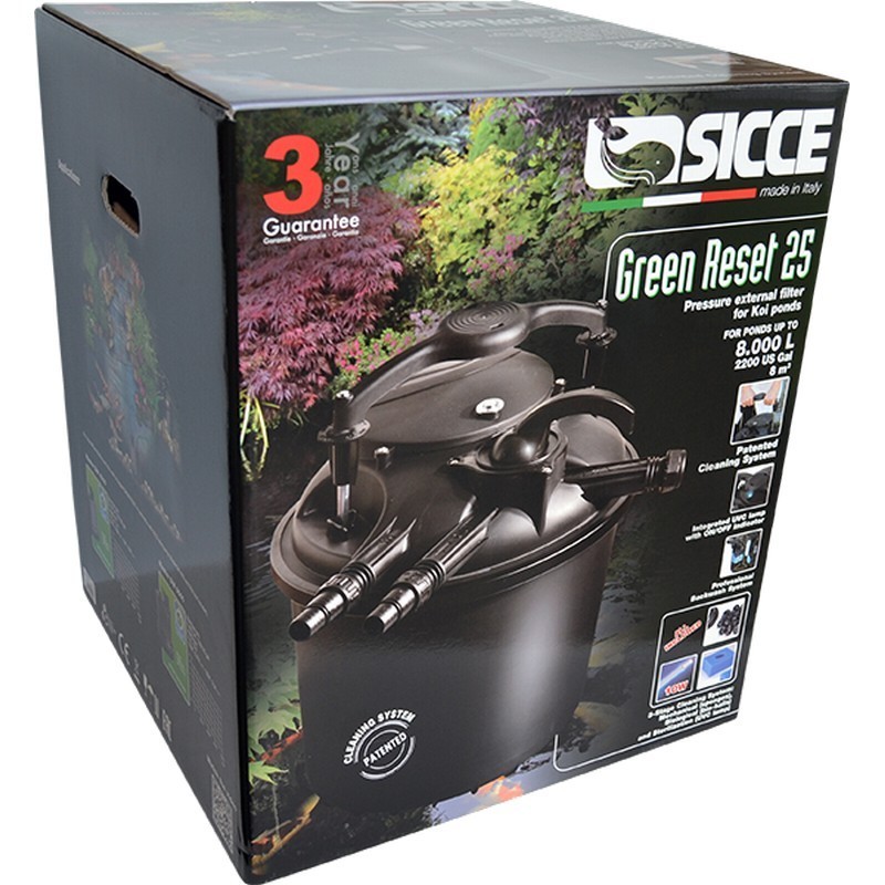 L'innovativa gamma di filtri esterni a pressione GREEN RESET offre il massimo in ambito di filtrazione di laghetti. Tutti i modelli sono dotati di lampada UVC, tecnologia Easy Clean, materiale filtrante e raccordi. La linea è composta da quattro modelli differenti che possono soddisfare diverse esigenze.